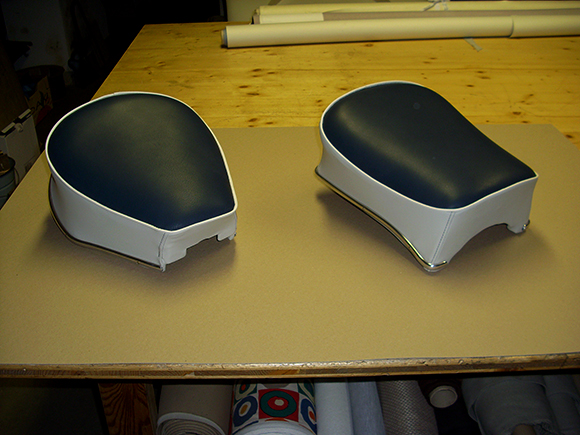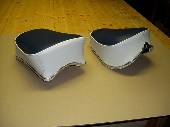Referenzen - Motorrad - AWO AWO - Motorradsattel: Neu gepolstert und bezogen mit dunkelblauen und lichtgrauen Leder mit weißen Keder abgesetzt.