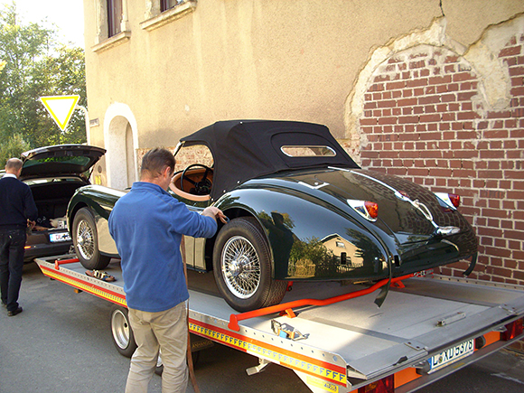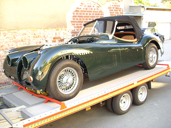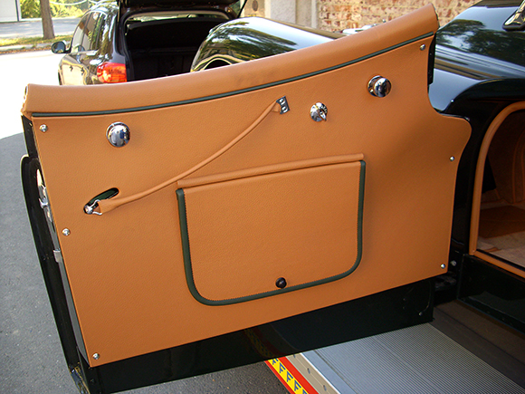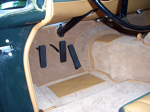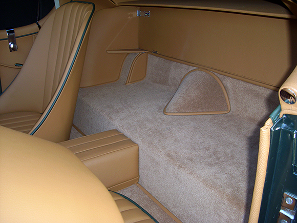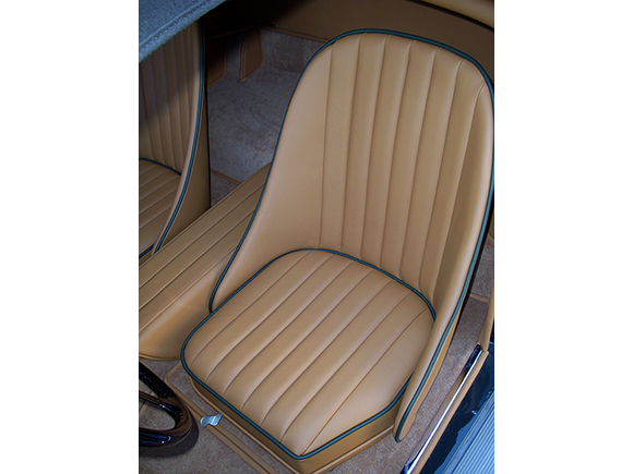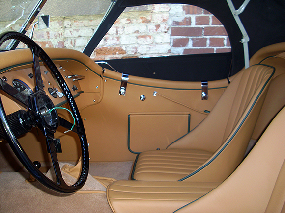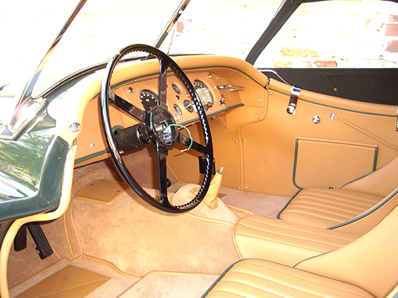 Referenzen - Oldtimer - Jaguar Jaguar XK 140 Roadster: Innenaustattung mit beigefarbenen Leder bezogen und mit dunkelgrünen Keder ähnlich der Außenfarbe abgesetzt. Sitze nach Kundenwunsch gepolstert und bezogen.